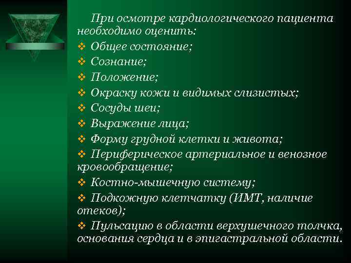 При осмотре кардиологического пациента необходимо оценить: v Общее состояние; v Сознание; v Положение; v Окраску кожи и видимых слизистых; v Сосуды шеи; v Выражение лица; v Форму грудной клетки и живота; v Периферическое артериальное и венозное кровообращение; v Костно-мышечную систему; v Подкожную клетчатку (ИМТ, наличие отеков); v Пульсацию в области верхушечного толчка, основания сердца и в эпигастральной области.