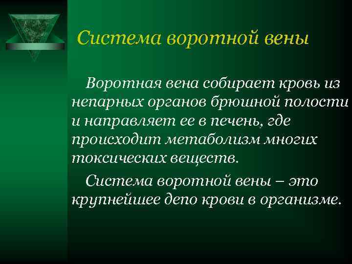 Система воротной вены Воротная вена собирает кровь из непарных органов брюшной полости и направляет ее в печень, где происходит метаболизм многих токсических веществ. Система воротной вены – это крупнейшее депо крови в организме.