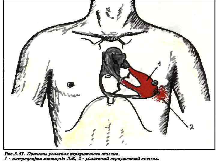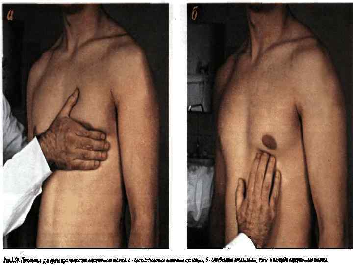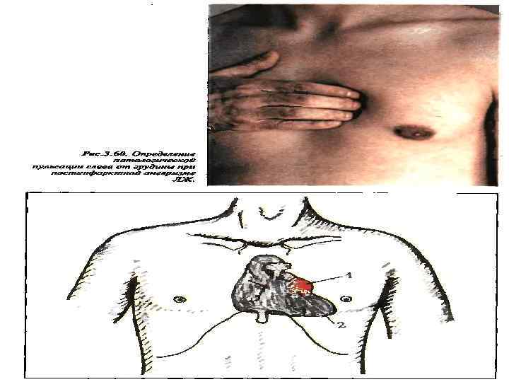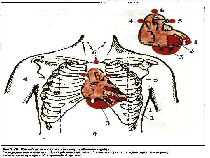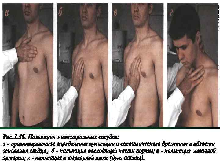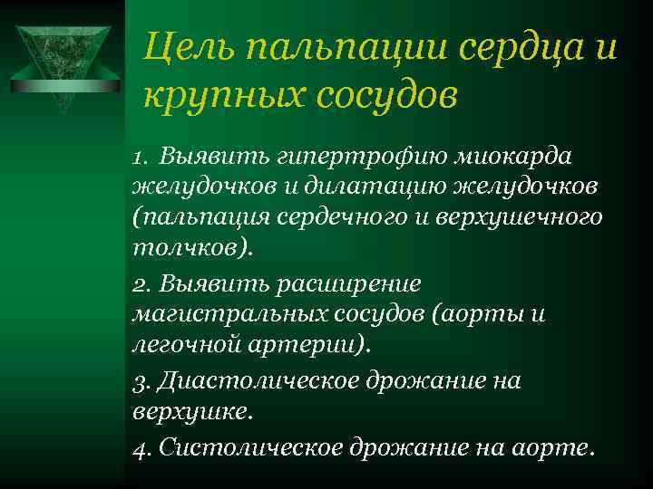Цель пальпации сердца и крупных сосудов 1. Выявить гипертрофию миокарда желудочков и дилатацию желудочков (пальпация сердечного и верхушечного толчков). 2. Выявить расширение магистральных сосудов (аорты и легочной артерии). 3. Диастолическое дрожание на верхушке. 4. Систолическое дрожание на аорте.