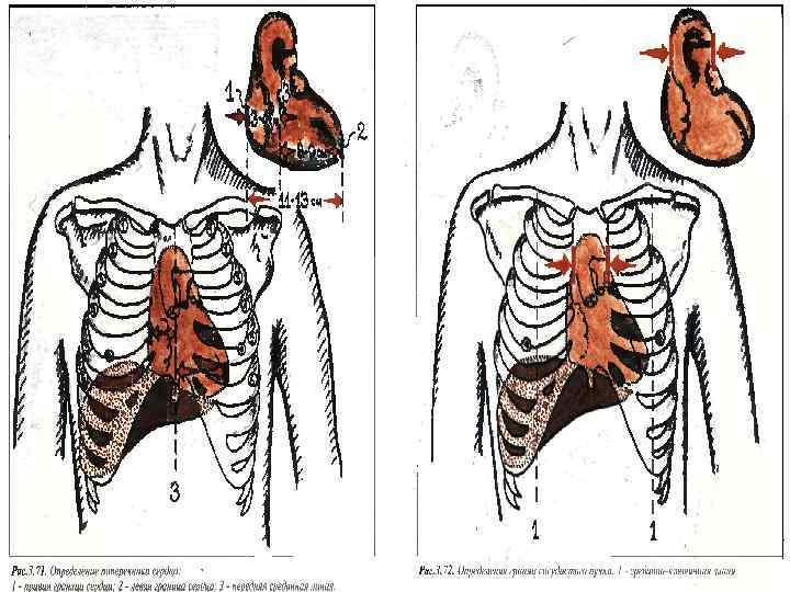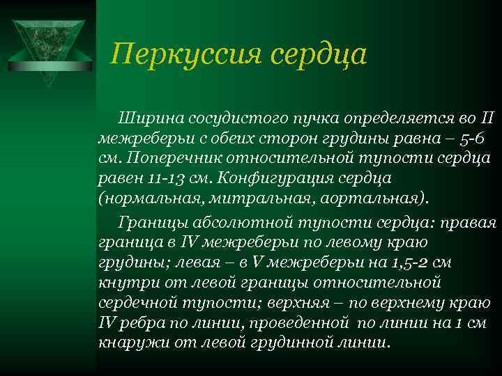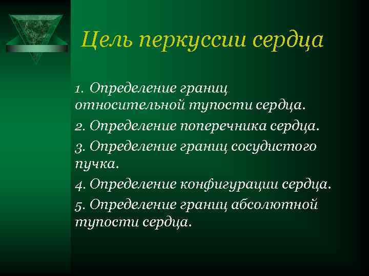 Цель перкуссии сердца 1. Определение границ относительной тупости сердца. 2. Определение поперечника сердца. 3. Определение границ сосудистого пучка. 4. Определение конфигурации сердца. 5. Определение границ абсолютной тупости сердца.