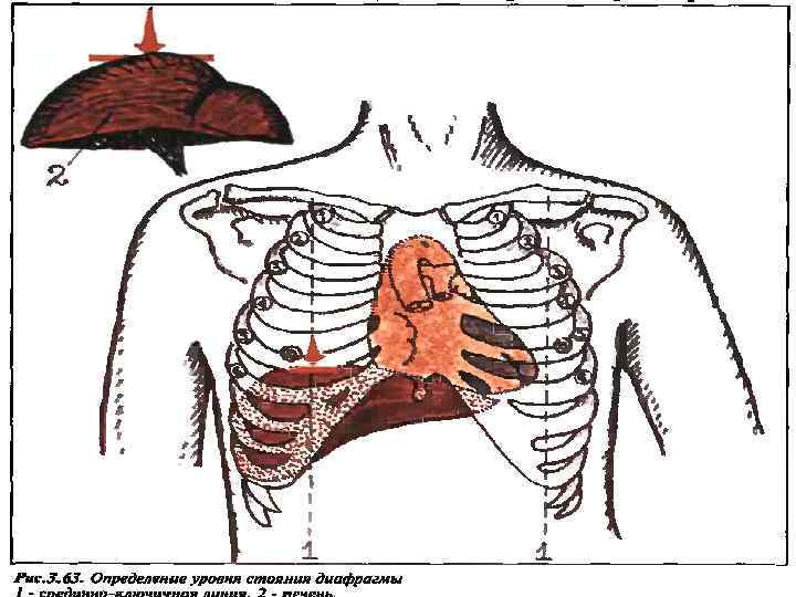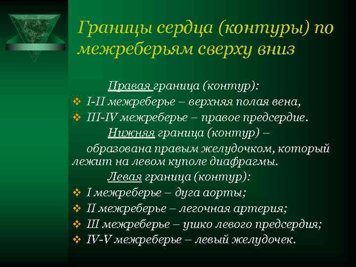 Границы сердца (контуры) по межреберьям сверху вниз Правая граница (контур): v I-II межреберье – верхняя полая вена, v III-IV межреберье – правое предсердие. Нижняя граница (контур) – образована правым желудочком, который лежит на левом куполе диафрагмы. Левая граница (контур): v I межреберье – дуга аорты; v II межреберье – легочная артерия; v Ш межреберье – ушко левого предсердия; v IV-V межреберье – левый желудочек.