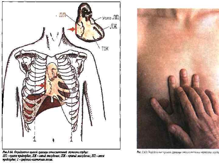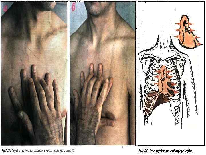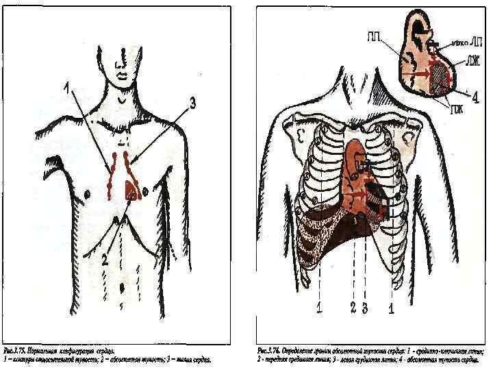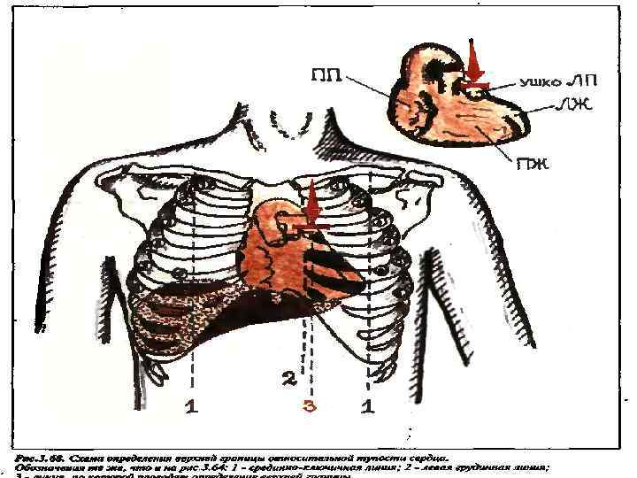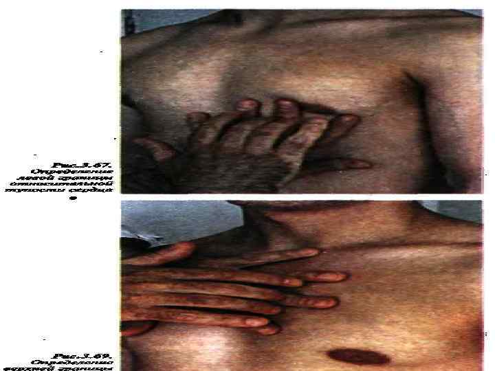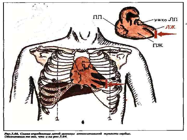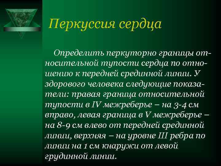 Перкуссия сердца Определить перкуторно границы относительной тупости сердца по отношению к передней срединной линии. У здорового человека следующие показатели: правая граница относительной тупости в IV межреберье – на 3 -4 см вправо, левая граница в V межреберье – на 8 -9 см влево от передней срединной линии, верхняя – на уровне III ребра по линии на 1 см кнаружи от левой грудинной линии.