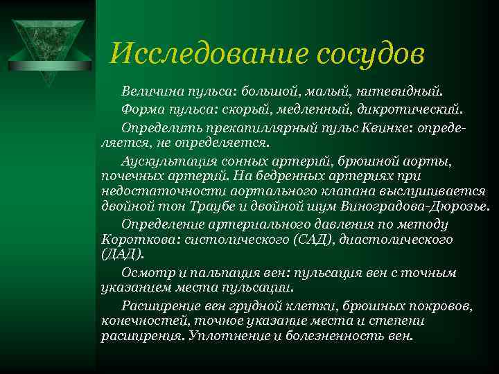Исследование сосудов Величина пульса: большой, малый, нитевидный. Форма пульса: скорый, медленный, дикротический. Определить прекапиллярный пульс Квинке: определяется, не определяется. Аускультация сонных артерий, брюшной аорты, почечных артерий. На бедренных артериях при недостаточности аортального клапана выслушивается двойной тон Траубе и двойной шум Виноградова-Дюрозье. Определение артериального давления по методу Короткова: систолического (САД), диастолического (ДАД). Осмотр и пальпация вен: пульсация вен с точным указанием места пульсации. Расширение вен грудной клетки, брюшных покровов, конечностей, точное указание места и степени расширения. Уплотнение и болезненность вен.