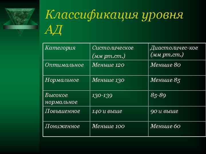 Классификация уровня АД Категория Систолическое (мм рт. ст. ) Диастоличес-кое (мм рт. ст. ) Оптимальное Меньше 120 Меньше 80 Нормальное Меньше 130 Меньше 85 Высокое нормальное 130 -139 85 -89 Повышенное 140 и выше 90 и выше Пониженное Меньше 100 Меньше 60