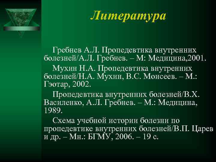 Литература Гребнев А. Л. Пропедевтика внутренних болезней/А. Л. Гребнев. – М: Медицина, 2001. Мухин Н. А. Пропедевтика внутренних болезней/Н. А. Мухин, В. С. Моисеев. – М. : Гэотар, 2002. Пропедевтика внутренних болезней/В. Х. Василенко, А. Л. Гребнев. – М. : Медицина, 1989. Схема учебной истории болезни по пропедевтике внутренних болезней/В. П. Царев и др. – Мн. : БГМУ, 2006. – 19 с.