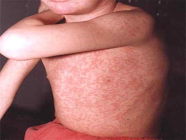 • Период высыпания начинается на 4 -5 день болезни и продолжается 3 -4 дня. Пятнисто-папулезная сыпь в начале появляется за ушами и в центре лица, потом распространяется на все лицо, шею, на туловище, на 3 -й день на конечности. • Элементы сыпи представляют собой розовые пятна неправильной формы диаметром до 5 мм. Они постепенно увеличиваются, приподнимаются над кожей и могут сливаться между собой. • Первые два дня тяжелые, сопровождаются высокой температурой, лицо одутловатое, насморк, кашель, у грудных детей может быть жидкий стул. • В период пигментации сыпь начинает темнеть (коричневый оттенок). Этот период длится 7 -10 дней, затем исчезает в том же порядке. В конце исчезновения сыпи и воспалительных процессов слизистых оболочек верхних дыхательных путей и глаз ребенок быстро поправляется.