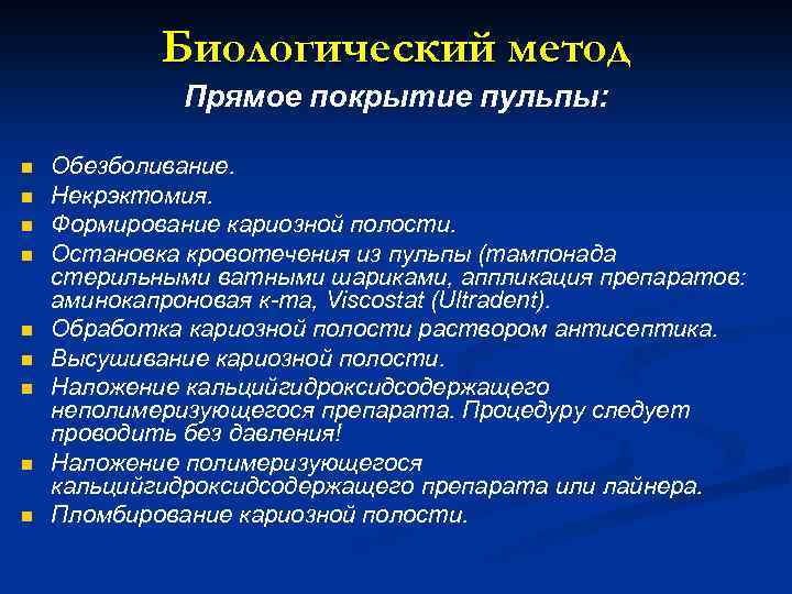 Биологический метод Прямое покрытие пульпы: n n n n n Обезболивание. Некрэктомия. Формирование кариозной полости. Остановка кровотечения из пульпы (тампонада стерильными ватными шариками, аппликация препаратов: аминокапроновая к-та, Viscostat (Ultradent). Обработка кариозной полости раствором антисептика. Высушивание кариозной полости. Наложение кальцийгидроксидсодержащего неполимеризующегося препарата. Процедуру следует проводить без давления! Наложение полимеризующегося кальцийгидроксидсодержащего препарата или лайнера. Пломбирование кариозной полости.