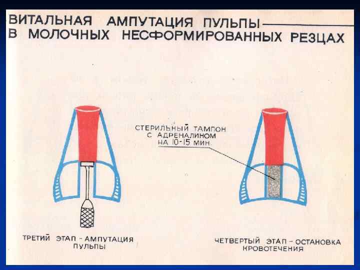 Витальная ампутация Показания к применению витальной ампутации пульпы в постоянных зубах при несформированном корне: n - острый травматический пульпит (если с момента травмы прошло более 6 ч или пульпа значительно обнажена); n - в тех случаях, если лечение пульпита биологическим методом оказалось неэффективным или противопоказано; n - острый серозный ограниченный пульпит; n - острый серозный диффузный пульпит (без выраженной реакции со стороны периодонта).
