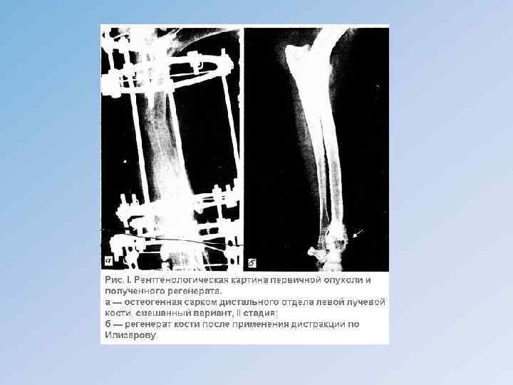 Основные принципы лечения первичных опухолей костей • Предоперационная химиотерапия • Оперативное лечение удаляют лишь часть кости с заменой на имплантат из пластика, металла или трупной кости. • Послеоперационная химиотерапия с учетом результатов предоперационной химиотерапии • Лучевую терапию как самостоятельный метод лечения сарком костей применяют редко в связи с низкой радиочувствительностью ряда первичных костных новообразований скелета. Облучение наиболее эффективно при лечении саркомы Юинга, ретикулосаркомы кости и саркомы мягких тканей, для которых характерна высокая чувствительность к радиации.