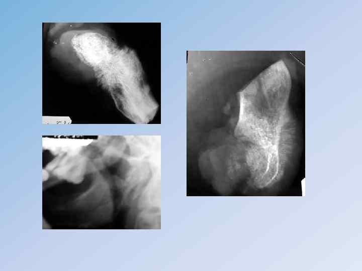 • • Рентгенологически различают следующие разновидности: 1) остеолитическая; 2) смешанная; 3) остеобластическая: а) центральный вариант; б) периферический вариант. Наиболее патогномоническими признаками являются своеобразные остеофиты, возникающие на границе наружного дефекта компактного слоя кости и внекостного компонента опухоли, они имеют вид характерного козырька или треугольной шпоры ( «козырек» Кодмана). Другой симптом – спикулы – тонкие игольчатые обызвествления, расположенные перпендикулярно к длинной оси кости. • Лечение комплексное, включающее лучевую и химиотерапию, хирургическое вмешательство. Оперативное пособие чаще всего заключается в ампутации, в последнее время выполняются сегментарные резекции с последующей костной пластикой или эндопротезированием. После проведенного комплексного лечения пятилетняя выживаемость составляет от 35, 5 до 60 %.