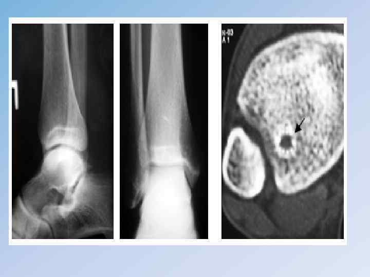 • Клиническая картина зависит от локализации – это боли в пораженной конечности, опухоль, нарушение функции. • При пальпации опухоли может ощущаться мелкий хруст, подобно хрусту снега, связанный с множественными мельчайшими переломами истонченного коркового слоя деформированной кости. Нередко наступает патологический перелом. • Рентгенологическая картина : Очаг поражения располагается асимметрично в эпиметафизарной зоне, имеет округлую форму и четко отграничен от неизмененной кости, вплоть до появления склеротического ободка. • Очаг может иметь ячеисто-трабекулярную структуру или вид однородного дефекта кости. Практически всегда наблюдается «вздутие» кости.