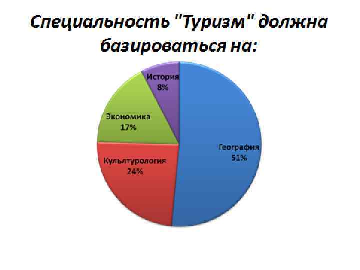 Специалистов по туризму в наше время готовят различные факультеты: географические, исторические, экономические, гуманитарные, управленческие Тем не менее, 51% всех опрошенных считает, что специальность «Туризм» должна базироваться на географии. 23% убеждены, что в основу специальности должна лечь культурология, 16% - экономика и только 8% - история.