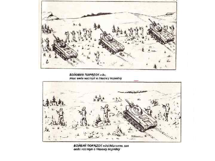 Бойовий порядок взводу в наступі Бойовий порядок взводу, що наступає на бойових машинах (бронетранспортерах), складається з бойової лінії бойових машин (бронетранспортерів) з інтервалом між ними до 100 м. та засобів посилення, які діють у бойовій лінії чи за нею. До 100 м. дшвід (пдвід, аемдвід) До 100 м. дшвід (пдвід, аемдвід) До 50 м. К