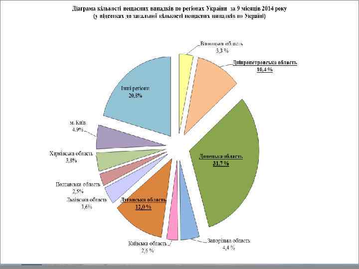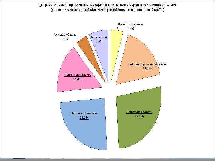 Аналіз професійної захворюваності за галузями промисловості: найвищий рівень профзахворюваності спостерігаємо під час добування енергетичних матеріалів (78, 9 %), видобування неенергетичних матеріалів (5, 8 %), виробництво машин та устатковання (3, 8 %), в металургії та під час оброблення металу (2, 8 %), в будівництві (3, 2 %). Кількість професійних захворювань у цих галузях становить близько 94 % від загальної кількості по Україні. У структурі професійних захворювань перше місце належить хворобам органів дихання – 68 % від загальної кількості по Україні (понад 3831 випадок). На другому місці – захворювання опорно рухового апарату – 20 % (радикулопатії, остеохондрози, артрити, артози – понад 1140 випадків). Третє місце залишається за вібраційною хворобою 4 % (205 випадків), четверте за хворобами органів слуху – 3 % (192 випадки).