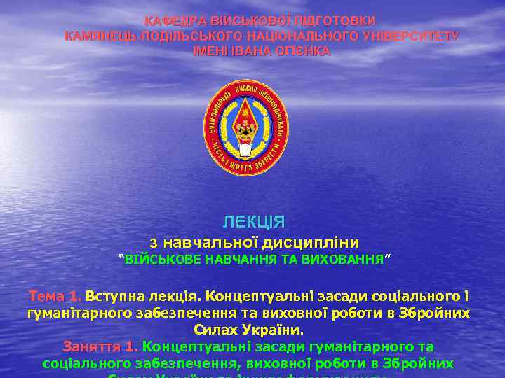 КАФЕДРА ВІЙСЬКОВОЇ ПІДГОТОВКИ КАМЯНЕЦЬ-ПОДІЛЬСЬКОГО НАЦІОНАЛЬНОГО УНІВЕРСИТЕТУ ІМЕНІ ІВАНА ОГІЄНКА ЛЕКЦІЯ з навчальної дисципліни “ВІЙСЬКОВЕ НАВЧАННЯ ТА ВИХОВАННЯ” ВИХОВАННЯ Тема 1. Вступна лекція. Концептуальні засади соціального і гуманітарного забезпечення та виховної роботи в Збройних Силах України. Заняття 1. Концептуальні засади гуманітарного та соціального забезпечення, виховної роботи в Збройних