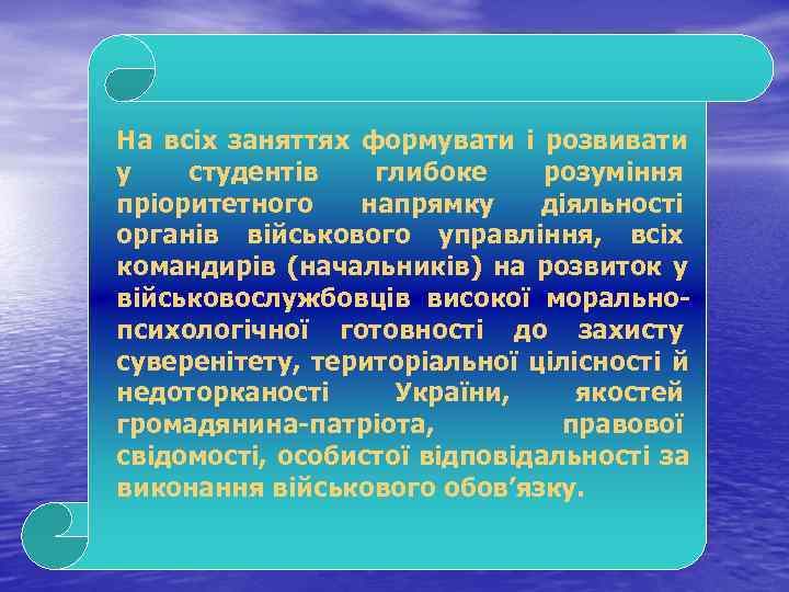 На всіх заняттях формувати і розвивати у студентів глибоке розуміння пріоритетного напрямку діяльності органів військового управління, всіх командирів (начальників) на розвиток у військовослужбовців високої морально психологічної готовності до захисту суверенітету, територіальної цілісності й недоторканості України, якостей громадянина патріота, правової свідомості, особистої відповідальності за виконання військового обов’язку.