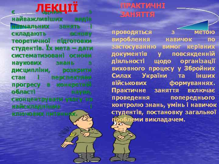 є ЛЕКЦІЇ одним з ПРАКТИЧНІ ЗАНЯТТЯ найважливіших видів навчальних занять і складають основу проводяться з метою теоретичної підготовки вироблення навичок по студентів. Їх мета – дати застосуванню вимог керівних систематизовані основи документів у повсякденній наукових знань з діяльності щодо організації дисципліни, розкрити виховного процесу у Збройних стан і перспективи Силах України та інших прогресу в конкретній військових формуваннях. області науки, Практичне заняття включає сконцентрувати увагу на проведення попереднього найскладніших і контролю знань, умінь і навичок ключових питаннях. студентів, постановку загальної проблеми викладачем.