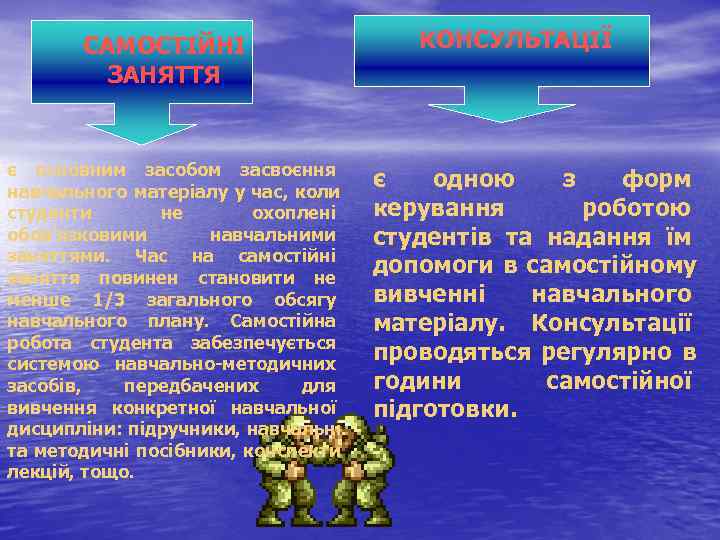 САМОСТІЙНІ КОНСУЛЬТАЦІЇ ЗАНЯТТЯ є основним засобом засвоєння навчального матеріалу у час, коли є одною з форм студенти не охоплені керування роботою обов’язковими навчальними студентів та надання їм заняттями. Час на самостійні заняття повинен становити не допомоги в самостійному менше 1/3 загального обсягу вивченні навчального плану. Самостійна матеріалу. Консультації робота студента забезпечується системою навчально методичних проводяться регулярно в засобів, передбачених для години самостійної вивчення конкретної навчальної підготовки. дисципліни: підручники, навчальні та методичні посібники, конспекти лекцій, тощо.