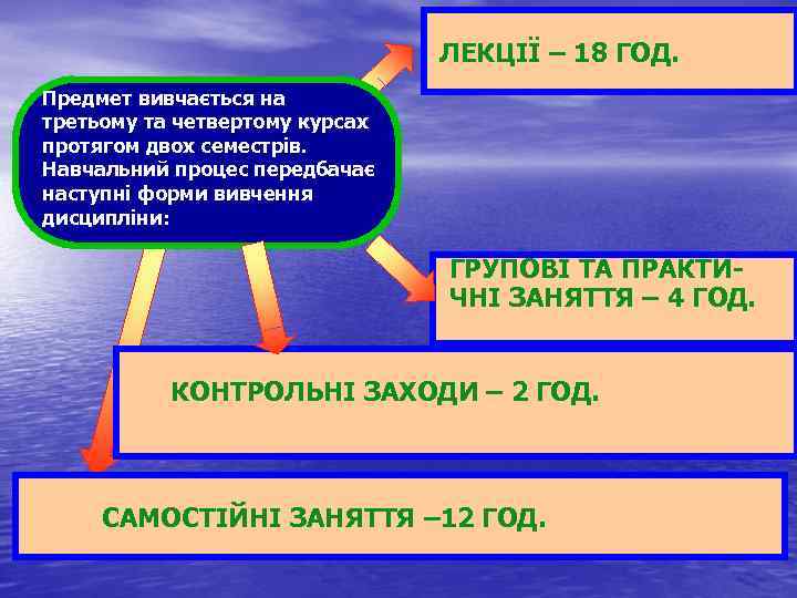 ЛЕКЦІЇ – 18 ГОД. Предмет вивчається на третьому та четвертому курсах протягом двох семестрів. Навчальний процес передбачає наступні форми вивчення дисципліни: ГРУПОВІ ТА ПРАКТИ ЧНІ ЗАНЯТТЯ – 4 ГОД. КОНТРОЛЬНІ ЗАХОДИ – 2 ГОД. САМОСТІЙНІ ЗАНЯТТЯ – 12 ГОД.