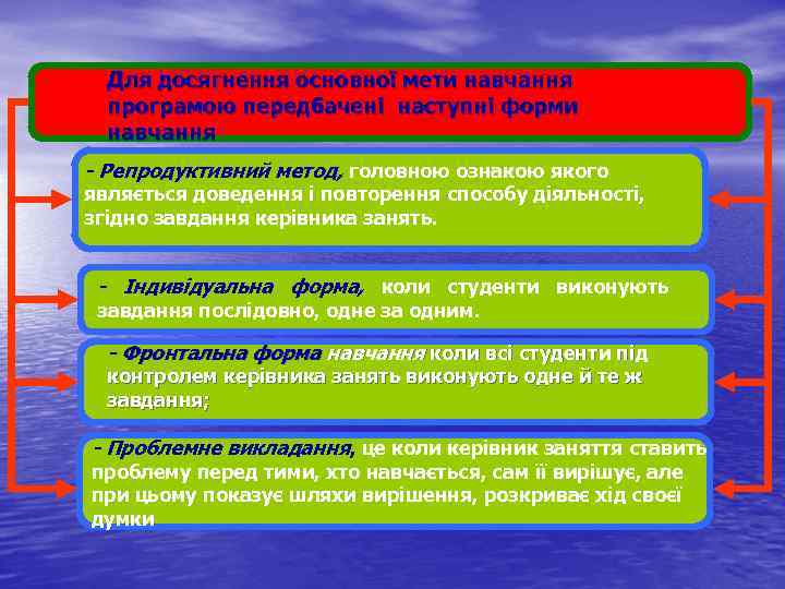 Для досягнення основної мети навчання програмою передбачені наступні форми навчання - Репродуктивний метод, головною ознакою якого являється доведення і повторення способу діяльності, згідно завдання керівника занять. - Індивідуальна форма, коли студенти виконують завдання послідовно, одне за одним. - Фронтальна форма навчання коли всі студенти під контролем керівника занять виконують одне й те ж завдання; - Проблемне викладання, це коли керівник заняття ставить проблему перед тими, хто навчається, сам її вирішує, але при цьому показує шляхи вирішення, розкриває хід своєї думки