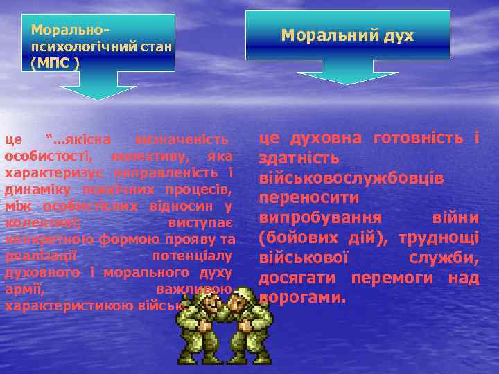 Морально Моральний дух психологічний стан (МПС ) це “. . . якісна визначеність це духовна готовність і особистості, колективу, яка здатність характеризує направленість і військовослужбовців динаміку психічних процесів, між особистісних відносин у переносити колективі; виступає випробування війни конкретною формою прояву та (бойових дій), труднощі реалізації потенціалу військової служби, духовного і морального духу досягати перемоги над армії, важливою характеристикою військ. ворогами.