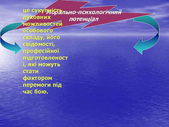 це сукупність Морально-психологічний духовних потенціал можливостей особового складу, його свідомості, професійної підготовленост і, які можуть стати фактором перемоги під час бою.
