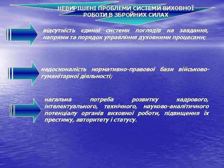 НЕВИРІШЕНІ ПРОБЛЕМИ СИСТЕМИ ВИХОВНОЇ РОБОТИ В ЗБРОЙНИХ СИЛАХ відсутність єдиної системи поглядів на завдання, напрями та порядок управління духовними процесами; недосконалість нормативно-правової бази військово- гуманітарної діяльності; нагальна потреба розвитку кадрового, інтелектуального, технічного, науково-аналітичного потенціалу органів виховної роботи, підвищення їх престижу, авторитету і статусу.
