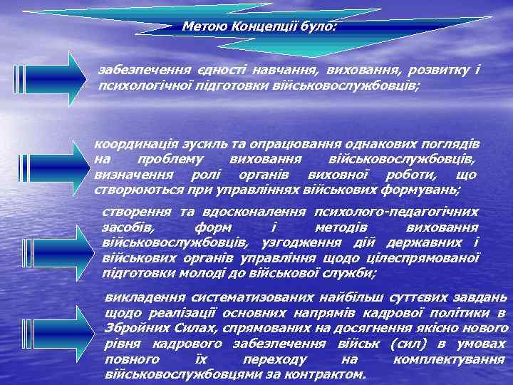 Метою Концепції було: забезпечення єдності навчання, виховання, розвитку і психологічної підготовки військовослужбовців; координація зусиль та опрацювання однакових поглядів на проблему виховання військовослужбовців, визначення ролі органів виховної роботи, що створюються при управліннях військових формувань; створення та вдосконалення психолого-педагогічних засобів, форм і методів виховання військовослужбовців, узгодження дій державних і військових органів управління щодо цілеспрямованої підготовки молоді до військової служби; викладення систематизованих найбільш суттєвих завдань щодо реалізації основних напрямів кадрової політики в Збройних Силах, спрямованих на досягнення якісно нового рівня кадрового забезпечення військ (сил) в умовах повного їх переходу на комплектування військовослужбовцями за контрактом.