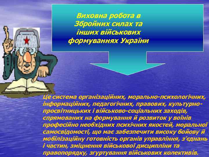 Виховна робота в Збройних силах та інших військових формуваннях України Це система організаційних, морально-психологічних, інформаційних, педагогічних, правових, культурно- просвітницьких і військово-соціальних заходів, спрямованих на формування й розвиток у воїнів професійно необхідних психічних якостей, моральної самосвідомості, що має забезпечити високу бойову й мобілізаційну готовність органів управління, з’єднань і частин, зміцнення військової дисципліни та правопорядку, згуртування військових колективів.