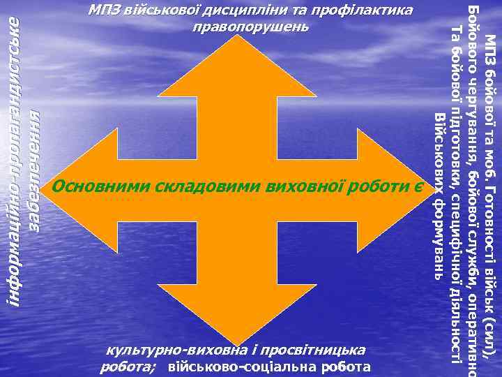 МПЗ військової дисципліни та профілактика Бойового чергування, бойової служби, оперативно правопорушень інформаційно-пропагандистське Та бойової підготовки, специфічної діяльності МПЗ бойової та моб. Готовності військ (сил), забезпечення Військових формувань Основними складовими виховної роботи є культурно-виховна і просвітницька робота; військово соціальна робота