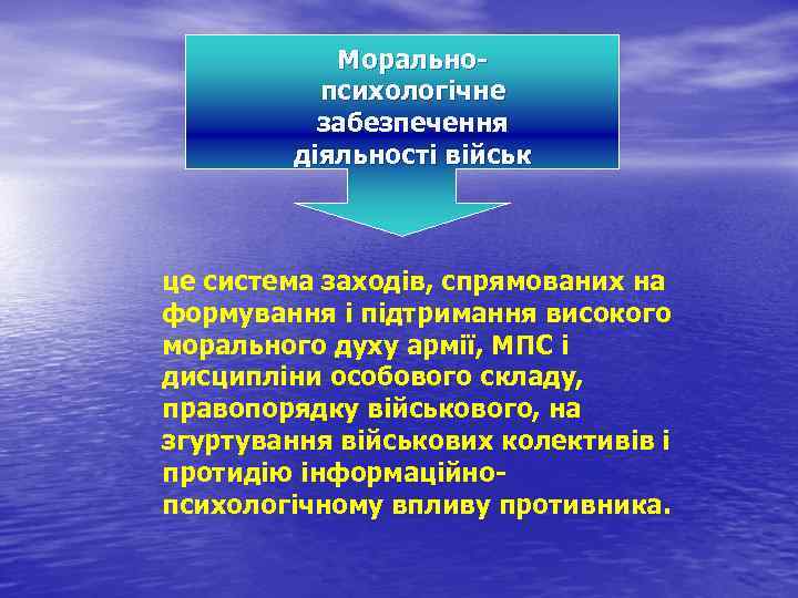Морально психологічне забезпечення діяльності військ це система заходів, спрямованих на формування і підтримання високого морального духу армії, МПС і дисципліни особового складу, правопорядку військового, на згуртування військових колективів і протидію інформаційно психологічному впливу противника.