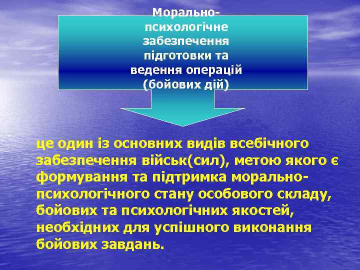 Морально психологічне забезпечення підготовки та ведення операцій (бойових дій) це один із основних видів всебічного забезпечення військ(сил), метою якого є формування та підтримка морально психологічного стану особового складу, бойових та психологічних якостей, необхідних для успішного виконання бойових завдань.