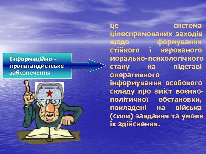 це система цілеспрямованих заходів щодо формування стійкого і керованого Інформаційно морально психологічного пропагандистське стану на підставі забезпечення оперативного інформування особового складу про зміст воєнно політичної обстановки, покладені на війська (сили) завдання та умови їх здійснення.