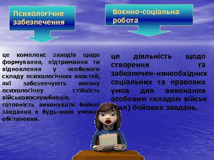 Психологічне Воєнно соціальна забезпечення робота це комплекс заходів щодо це діяльність щодо формування, підтримання ти створення та відновлення у особового складу психологічних якостей, забезпечен нянеобхідних які забезпечують високу соціальних та правових психологічну стійкість умов для виконання військовослужбовців, особовим складом військ готовність виконувати бойові (сил) бойових завдань. завдання в будь яких умовах обстановки.