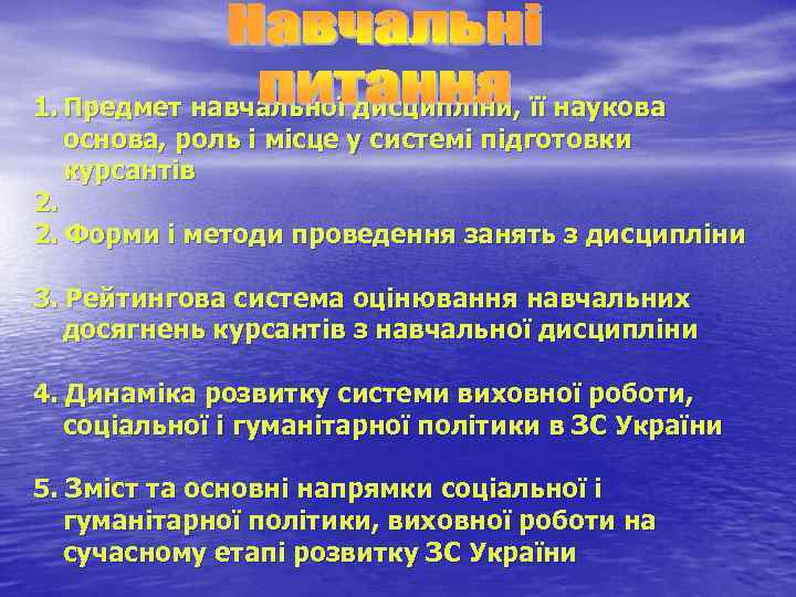 1. Предмет навчальної дисципліни, її наукова основа, роль і місце у системі підготовки курсантів 2. 2. Форми і методи проведення занять з дисципліни 3. Рейтингова система оцінювання навчальних досягнень курсантів з навчальної дисципліни 4. Динаміка розвитку системи виховної роботи, соціальної і гуманітарної політики в ЗС України 5. Зміст та основні напрямки соціальної і гуманітарної політики, виховної роботи на сучасному етапі розвитку ЗС України