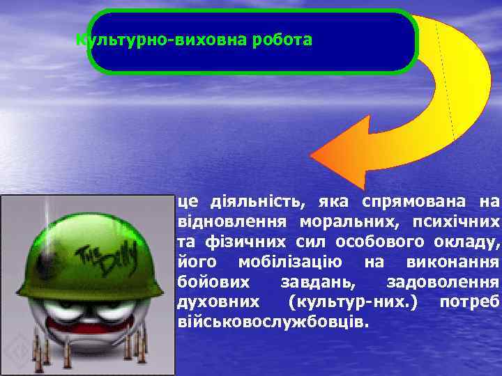 Культурно виховна робота це діяльність, яка спрямована на відновлення моральних, психічних та фізичних сил особового окладу, його мобілізацію на виконання бойових завдань, задоволення духовних (культур них. ) потреб військовослужбовців.