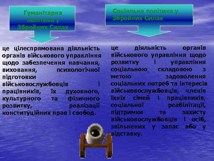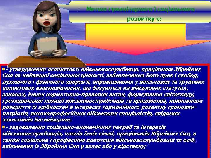 Метою гуманітарного і соціального розвитку є: • - утвердження особистості військовослужбовця, працівника Збройних Сил як найвищої соціальної цінності, забезпечення його прав і свобод, духовного і фізичного здоров'я, впровадження у військових та трудових колективах взаємовідносин, що базуються на військових статутах, законах, інших нормативно-правових актах, формування світогляду, громадянської позиції військовослужбовців та працівників, найповніше розкриття їх здібностей в інтересах гармонійного розвитку громадян- патріотів, високопрофесійних військових спеціалістів, свідомих захисників Батьківщини; • - задоволення соціально-економічних потреб та інтересів військовослужбовців, членів їхніх сімей, працівників Збройних Сил, а також соціальна і професійна адаптація військовослужбовців та осіб, звільнених із Збройних Сил у запас або у відставку;