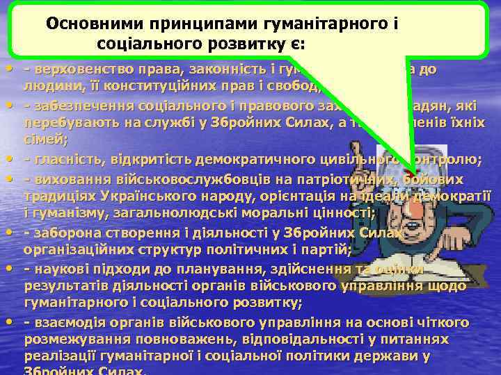 Основними принципами гуманітарного і соціального розвитку є: • верховенство права, законність і гуманність, повага до людини, її конституційних прав і свобод; • забезпечення соціального і правового захисту громадян, які перебувають на службі у Збройних Силах, а також членів їхніх сімей; • гласність, відкритість демократичного цивільного контролю; • виховання військовослужбовців на патріотичних, бойових традиціях Українського народу, орієнтація на ідеали демократії і гуманізму, загальнолюдські моральні цінності; • заборона створення і діяльності у Збройних Силах організаційних структур політичних і партій; • наукові підходи до планування, здійснення та оцінки результатів діяльності органів військового управління щодо гуманітарного і соціального розвитку; • взаємодія органів військового управління на основі чіткого розмежування повноважень, відповідальності у питаннях реалізації гуманітарної і соціальної політики держави у