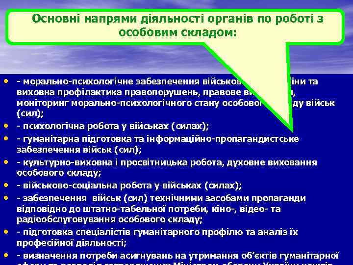 Основні напрями діяльності органів по роботі з особовим складом: • морально психологічне забезпечення військової дисципліни та виховна профілактика правопорушень, правове виховання, моніторинг морально психологічного стану особового складу військ (сил); • психологічна робота у військах (силах); • гуманітарна підготовка та інформаційно пропагандистське забезпечення військ (сил); • культурно виховна і просвітницька робота, духовне виховання особового складу; • військово соціальна робота у військах (силах); • забезпечення військ (сил) технічними засобами пропаганди відповідно до штатно табельної потреби, кіно , відео та радіообслуговування особового складу; • підготовка спеціалістів гуманітарного профілю та аналіз їх професійної діяльності; • визначення потреби асигнувань на утримання об’єктів гуманітарної
