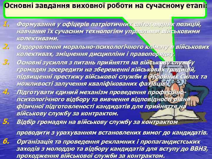 Основні завдання виховної роботи на сучасному етапі: 1. Формування у офіцерів патріотичних світоглядних позицій, навчання їх сучасним технологіям управління військовими колективами. 2. Оздоровлення морально-психологічного клімату в військових колективах, зміцнення дисципліни і правопорядку. 3. Основні зусилля з питань прийняття на військову службу громадян зосередити на збереженні військових традицій, підвищенні престижу військової служби в Збройних Силах та можливості залучення кваліфікованих фахівців. 4. Підготувати єдиний механізм проведення професійно- психологічного відбору та вивчення відповідності рівня фізичної підготовленості кандидатів для прийняття на військову службу за контрактом. 5. Відбір громадян на військову службу за контрактом проводити з урахуванням встановлених вимог до кандидатів. 6. Організація та проведення рекламних і пропагандистських заходів з молоддю та відбору кандидатів для вступу до ВВНЗ, проходження військової служби за контрактом.