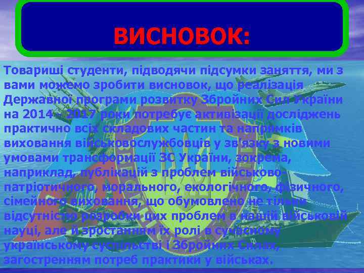 ВИСНОВОК: Товариші студенти, підводячи підсумки заняття, ми з вами можемо зробити висновок, що реалізація Державної програми розвитку Збройних Сил України на 2014 2017 роки потребує активізації досліджень практично всіх складових частин та напрямків виховання військовослужбовців у зв’язку з новими умовами трансформації ЗС України, зокрема, наприклад, публікацій з проблем військово патріотичного, морального, екологічного, фізичного, сімейного виховання, що обумовлено не тільки відсутністю розробки цих проблем в нашій військовій науці, але й зростанням їх ролі в сучасному українському суспільстві і Збройних Силах, загостренням потреб практики у військах.