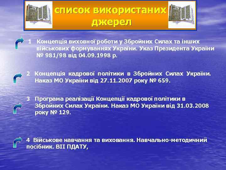 список використаних джерел 1 Концепція виховної роботи у Збройних Силах та інших військових формуваннях України. Указ Президента України № 981/98 від 04. 09. 1998 р. 2 Концепція кадрової політики в Збройних Силах України. Наказ МО України від 27. 11. 2007 року № 659. 3 Програма реалізації Концепції кадрової політики в Збройних Силах України. Наказ МО України від 31. 03. 2008 року № 129. 4 Військове навчання та виховання. Навчально методичний посібник. ВІІ ПДАТУ,