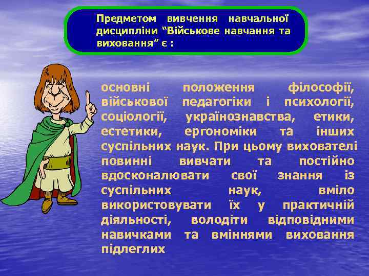Предметом вивчення навчальної дисципліни “Військове навчання та виховання” є : основні положення філософії, військової педагогіки і психології, соціології, українознавства, етики, естетики, ергономіки та інших суспільних наук. При цьому вихователі повинні вивчати та постійно вдосконалювати свої знання із суспільних наук, вміло використовувати їх у практичній діяльності, володіти відповідними навичками та вміннями виховання підлеглих
