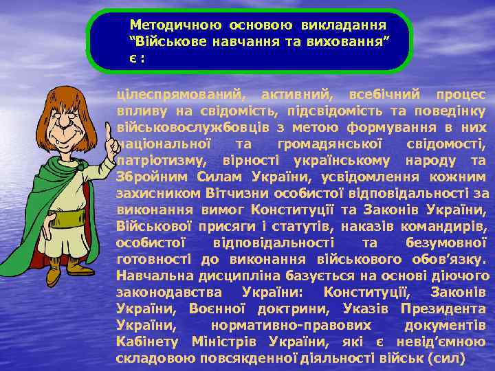 Методичною основою викладання “Військове навчання та виховання” є: цілеспрямований, активний, всебічний процес впливу на свідомість, підсвідомість та поведінку військовослужбовців з метою формування в них національної та громадянської свідомості, патріотизму, вірності українському народу та Збройним Силам України, усвідомлення кожним захисником Вітчизни особистої відповідальності за виконання вимог Конституції та Законів України, Військової присяги і статутів, наказів командирів, особистої відповідальності та безумовної готовності до виконання військового обов’язку. Навчальна дисципліна базується на основі діючого законодавства України: Конституції, Законів України, Воєнної доктрини, Указів Президента України, нормативно правових документів Кабінету Міністрів України, які є невід’ємною складовою повсякденної діяльності військ (сил)