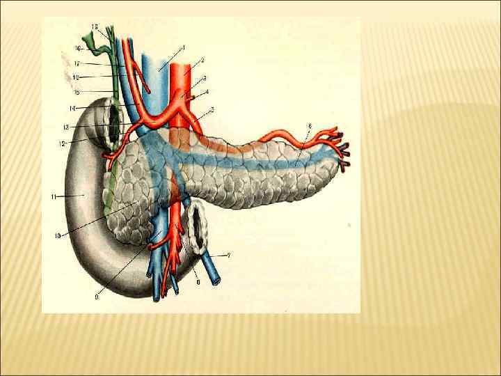 Взаимоотношение поджелудочной железы с двенадцатиперстной кишкой, общим желчным протоком, воротной и нижней полой венами, брюшной аортой и ее ветвями Воротная вена (V. porta) образуется позади головки поджелудочной железы двумя, тремя или четырьмя венозными стволами. Вена направляется вверх и вправо, располагаясь между двумя брюшинными листками печеночно-дуоденальной связки. Впереди ствола воротной вены проходят печеночная артерия и общий желчный проток, артерия лежит слева, а проток справа от вены. Возможны анатомические индивидуальные особенности. Место слияния вен и образования ствола воротной вен находится на уровне II поясничного позвонка, иногда на уровне III поясничного или XII грудного. Начальная часть воротной вены чаще проецируется между I и II поясничным позвонком.