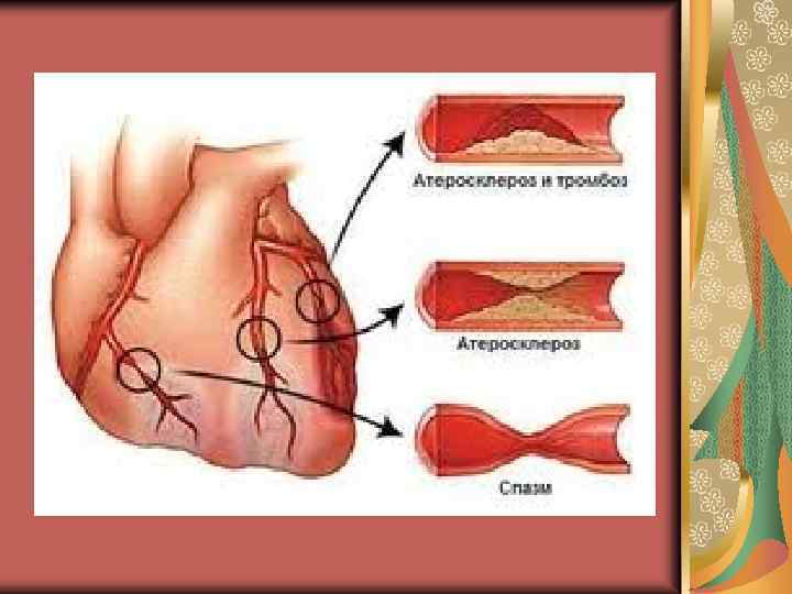 Причины внутри сосуда: атеросклеротическое сужения просвета венечных артерий; тромбоз и тромбоэмболия венечных артерий; спазм венечных артерий. Причины вне сосуда: тахикардия; гипертрофия миокарда; артериальная гипертензия.