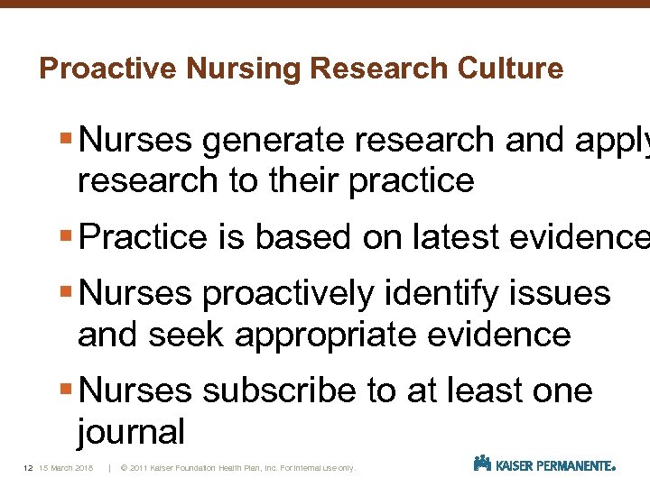 Responsive Nursing Research Culture § Nurses participate in research projects; rarely initiate § Nurses generate questions about practice; may occasionally use evidence to drive practice changes § Nurses belong to at least one professional organization § Nurses seek advice, resources, information to answer ethical questions in translational research 11 15 March 2018 | © 2011 Kaiser Foundation Health Plan, Inc. For internal use only.