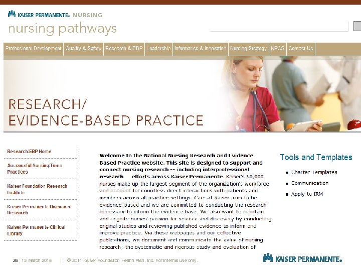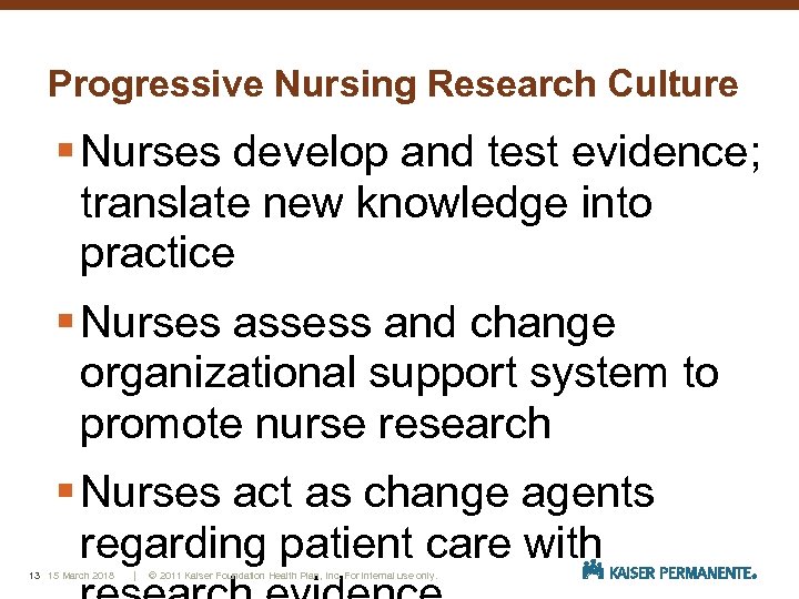 Progressive Nursing Research Culture § Nurses develop and test evidence; translate new knowledge into practice § Nurses assess and change organizational support system to promote nurse research § Nurses act as change agents regarding patient care with 13 15 March 2018 | © 2011 Kaiser Foundation Health Plan, Inc. For internal use only.