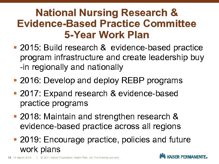 High Performing Nursing Research Culture § Nurses are actively involved in generating and disseminating research on national and international levels § Nursing knows that executive leadership not only supports ongoing research and evidencebased practice, but also expects it 14 15 March 2018 | © 2011 Kaiser Foundation Health Plan, Inc. For internal use only.