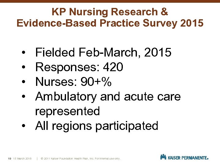 Nursing Research 2015 Priorities 1. Committee development • Representation • Monthly webinars • Multiple subcommittees 2. Conduct survey 3. Initiate research 4. Create dashboard 5. Launch website 18 15 March 2018 | © 2011 Kaiser Foundation Health Plan, Inc. For internal use only. √ √